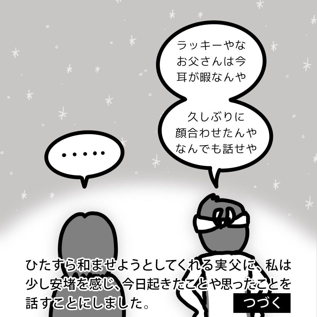 話をしようとこえをかけてくれた実父。私は我慢しきれず交通事故の保険のことや今日の通夜までの不信感をぶつけると…