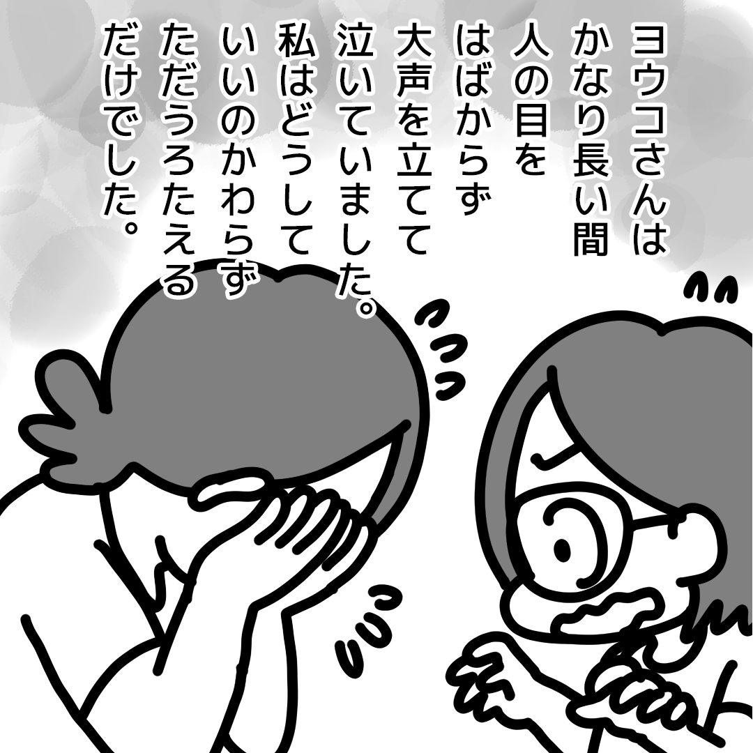 おばさんの思わぬ謝罪に私は焦ってしまうのですが、私はその態度がよく思えなくなってしまっていました。いったん席を離れたときに、とある物を見つけて考えが変わります。