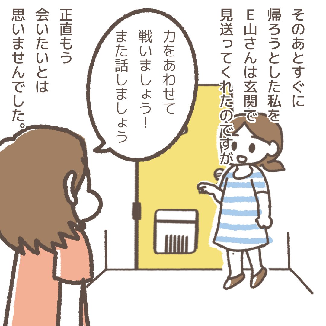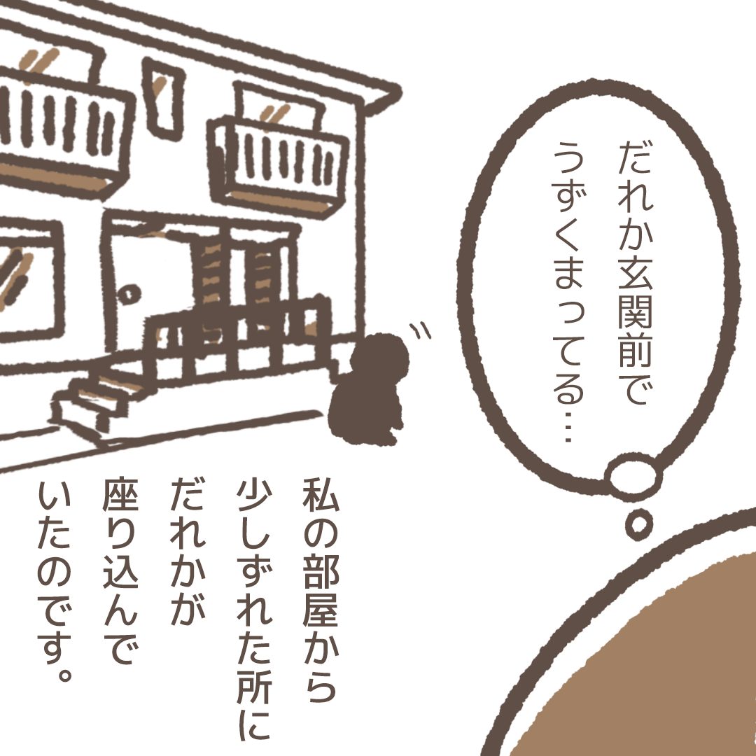 お向かいのご近所さん、E山さんとの話が終わりぐったりと疲れたわたし。E山さんはまた話をしたがっているようでしたが私はもう関わりたくありませんでした。その帰り、自分の部屋のちかくに誰かがうずくまっているのが見えました。その人影は一体…?