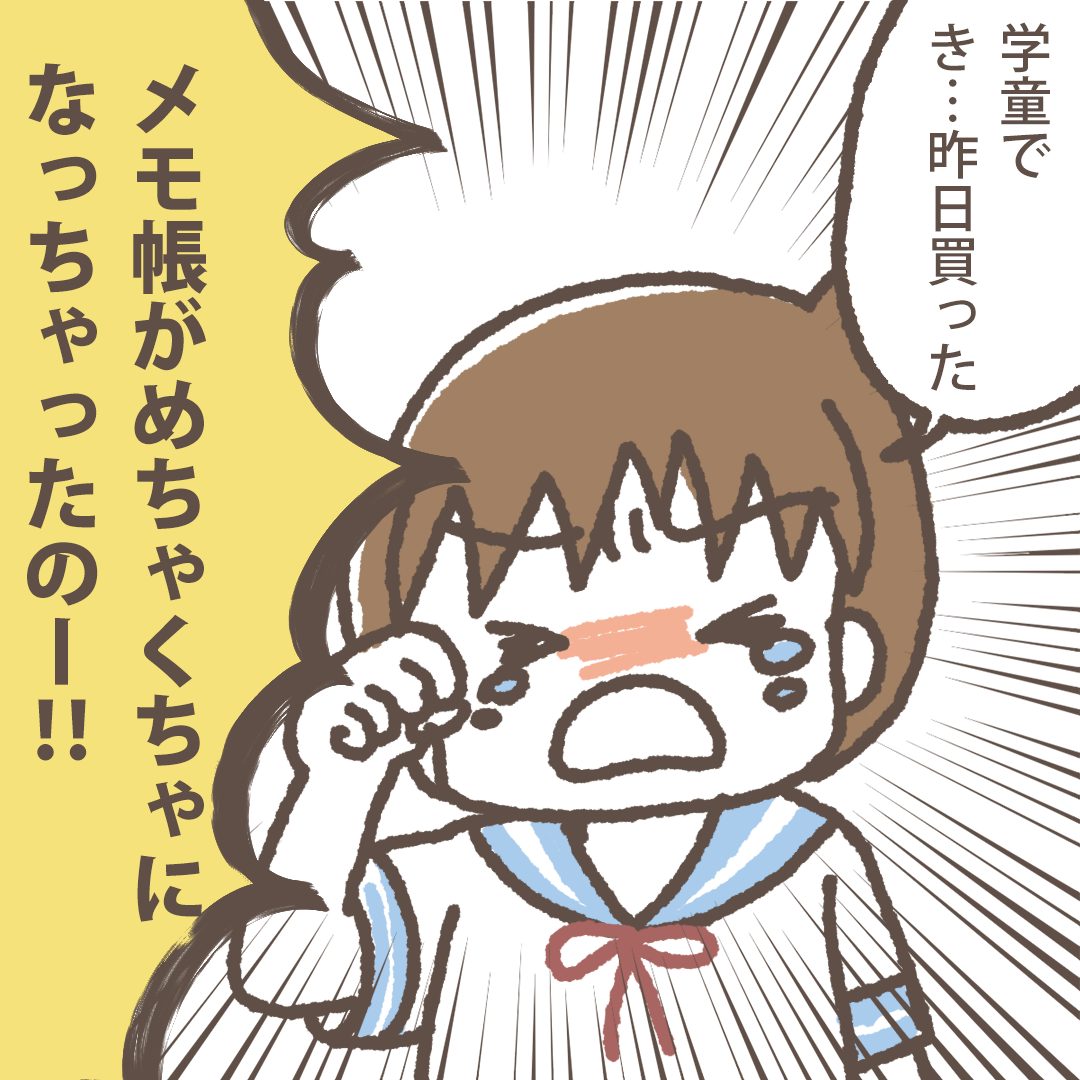 ムスメが学童でトラブルに巻き込まれたお話【3】泣いている理由は、昨日買ったメモだと泣きながらいうムスメ。私はびっくりしました。彼女のいうメモ帳は昨日買ったばかりだったからです。しかもあんなにうれしそうだったのに…。